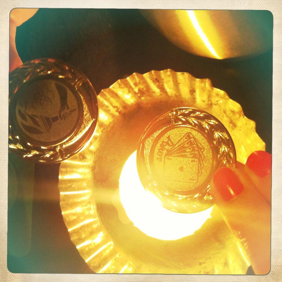 Jeg har både en guldmedalje og en bronzemedalje fra Jernbanecaféen, der også fungerer som oplukker. Jeg kaster dem gerne i medalje-puljen – så har jeg nemlig en undskyldning for at forsøge at anskaffe mig nogle flere. Stemmer også for den pædagogiske løsning. Ellers kunne jeg jo hurtigt komme til at bruge hele aftenen på at gå og undskylde for, at jeg har vundet 🙂