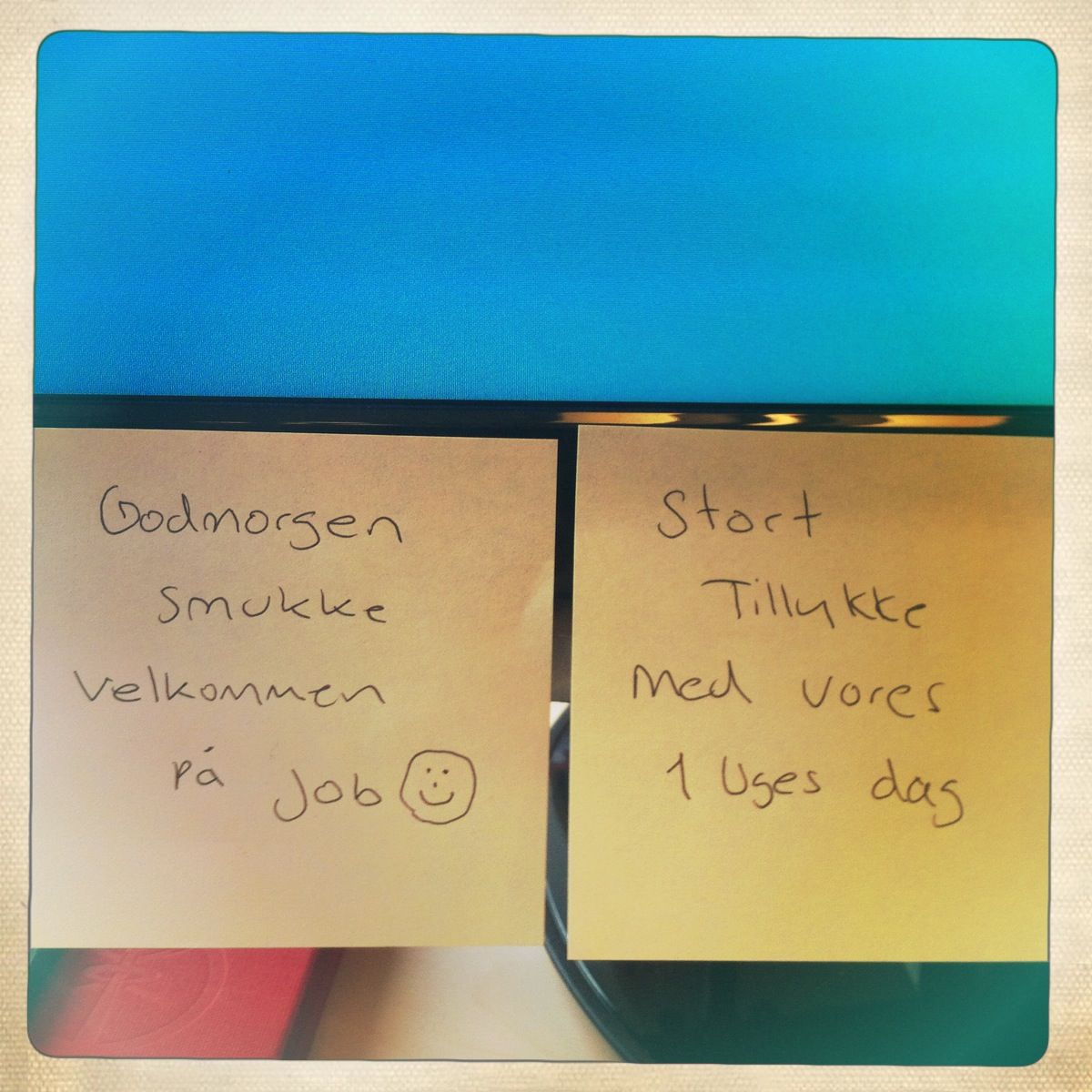 PS: Oven på medicinsk rutsjebanetur var det utroligt tiltrængt at komme på arbejde og se et skrivebord, der var overpyntet med flag. Først blev jeg forvirret over, om en af mine personligheder mon havde fødselsdag, men pludselig gik det op for mig, at det er fordi, jeg har 1 uges dag med min placebo-kæreste, uglen. Vi fandt sammen i dødsdruks-brandert sidste fredag, hvor vi besluttede os for, at når vi nu begge to er singler og i øvrigt sidder 10 meter fra hinanden 37+ timer om ugen, kunne vi jo lige så godt udnytte tiden og den korte distance til at minde hinanden om, at vi hver især er nogle helt okay single-typer. Derfor har ugen stået på klæbrige post-its og slibrige mails. Jeg er fan af konceptet og synes, det er en sand win-win. Specielt fordi guldfisken netop har gjort mig opmærksom på, at det altså slet ikke er sådan noget, man gør, hvis man havner i et normalt parforhold.