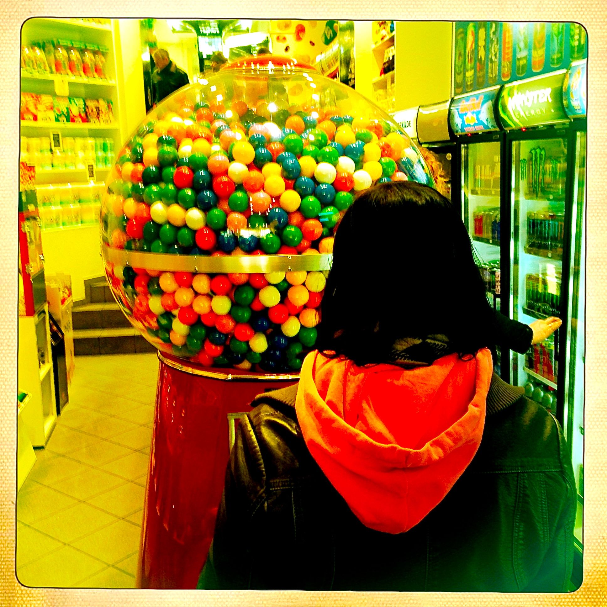 I mellemtiden kunne jeg så fordrive tiden med at falde i staver over jordens ottende vidunder, som jeg fandt i Candy Megastore. Den største slikautomat, jeg nogensinde har set. Jeg ville jo blive verdens mest dobbeltmoralske mor, som forsøger at tvangsfodre potentielt fremtidig unge med discountspelt og porrekompot på bud, så jeg selv kan spare femmere sammen til min daglige pilgrimsrejse til gigantautomaten.