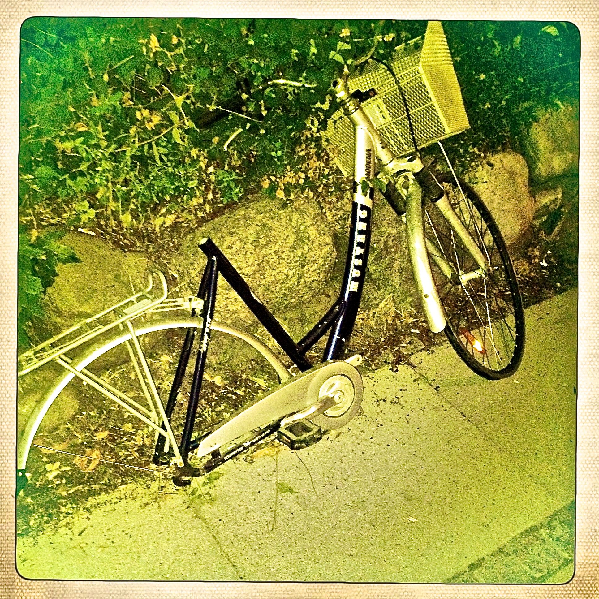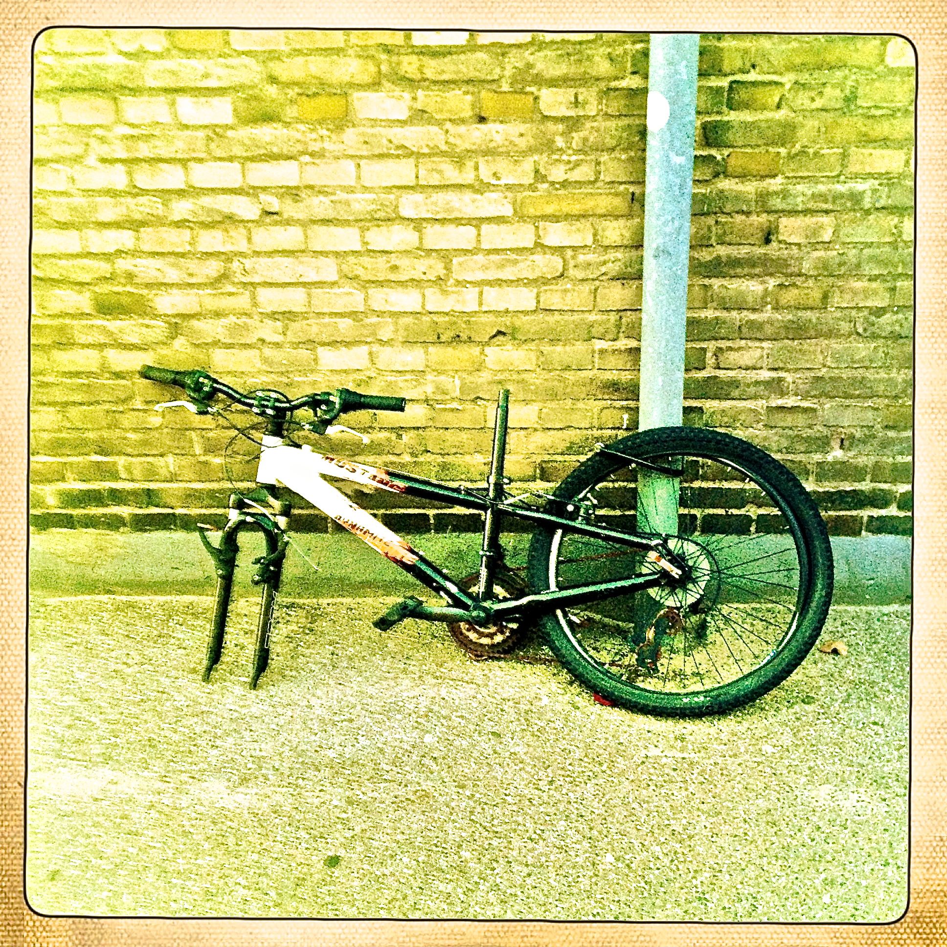 Det tog lidt tid at få kickstartet knoglerne igen, men nu har jeg haft hele pivtøjet (beklager muligvis upassende ordvalg) ude på en testrun (som egentlig mest var en testwalk). Det er ret svært for mig at gennemføre sådan en tur uden at tage billeder. Helst en 10-15 stykker. Måske er det en form for mani. Jeg kan i hvert fald ikke lade være, og for det meste gør jeg det helt uden at lægge mærke til det. Jeg kan ikke altid forklare, hvorfor jeg bare MÅ tage billeder af en sten eller et dyr eller en halvtom juicekarton. Måske hænger det sammen med min trang til at gemme alt. Alle minder. Alt, hvad der har talt til mig eller rørt mig (som halvtomme juicekartonner jo ofte gør). For det hele har en eller anden historie. Og hvis ikke den er spændende nok, sørger min fantasi for, at den bliver det. I går tog jeg et billede af en cykel som det første. Jeg registrede slet ikke, at jeg gjorde det. Det skete bare. Bagefter tænkte jeg, at der sikkert var en mening med det billede på en eller anden måde.
