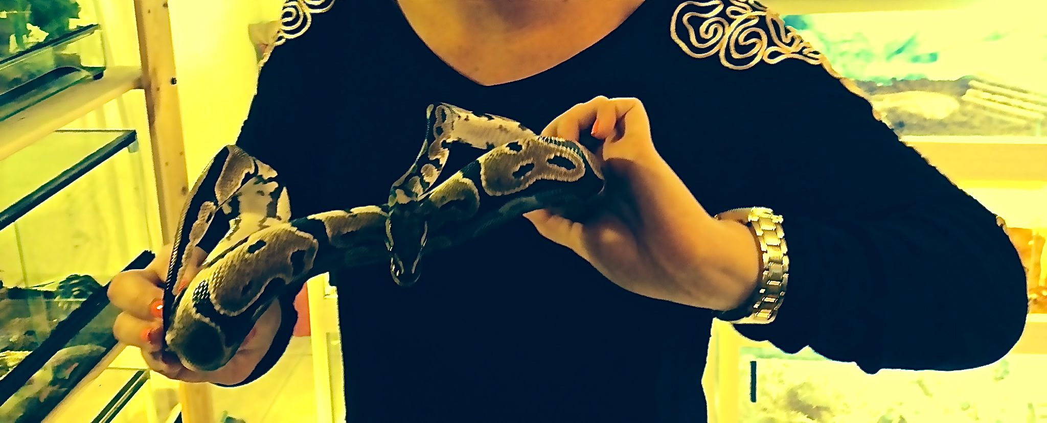 Og så mødte jeg Elvis. Ikke kongen, desværre. Men slangen Elvis, som er i pleje hos familien. Min grundangst for slanger har jeg vist fortalt rigeligt om, så det vil jeg lade være med at gå i detaljer med nu. Der var dog et eller andet over Elvis, som gjorde, at han ikke var helt så frygtelig som artsfællerne i burene ved siden af. Måske var det navnet. Jeg ved det ikke. Men jeg blev nødt til at bide al angst i mig og befamle ham. Og eftersom jeg allerede havde halvtømt blæren én gang, kunne det jo ikke gå helt galt.